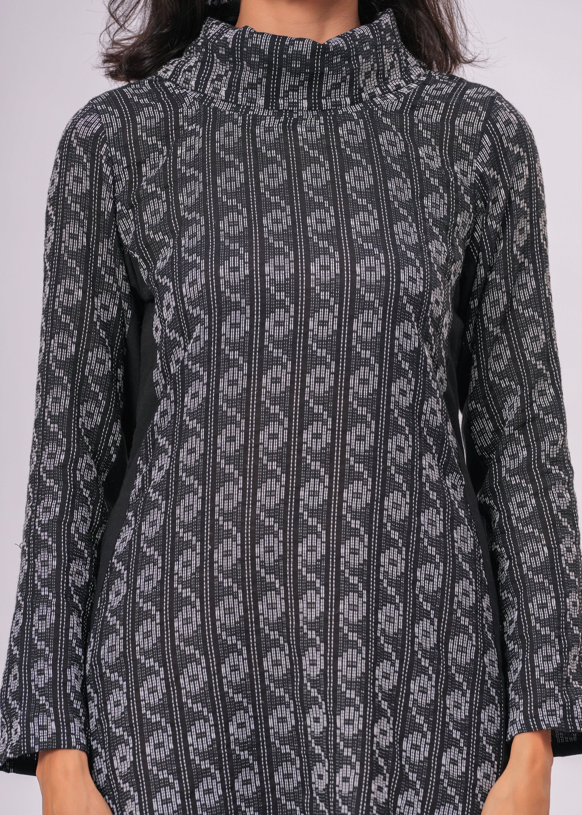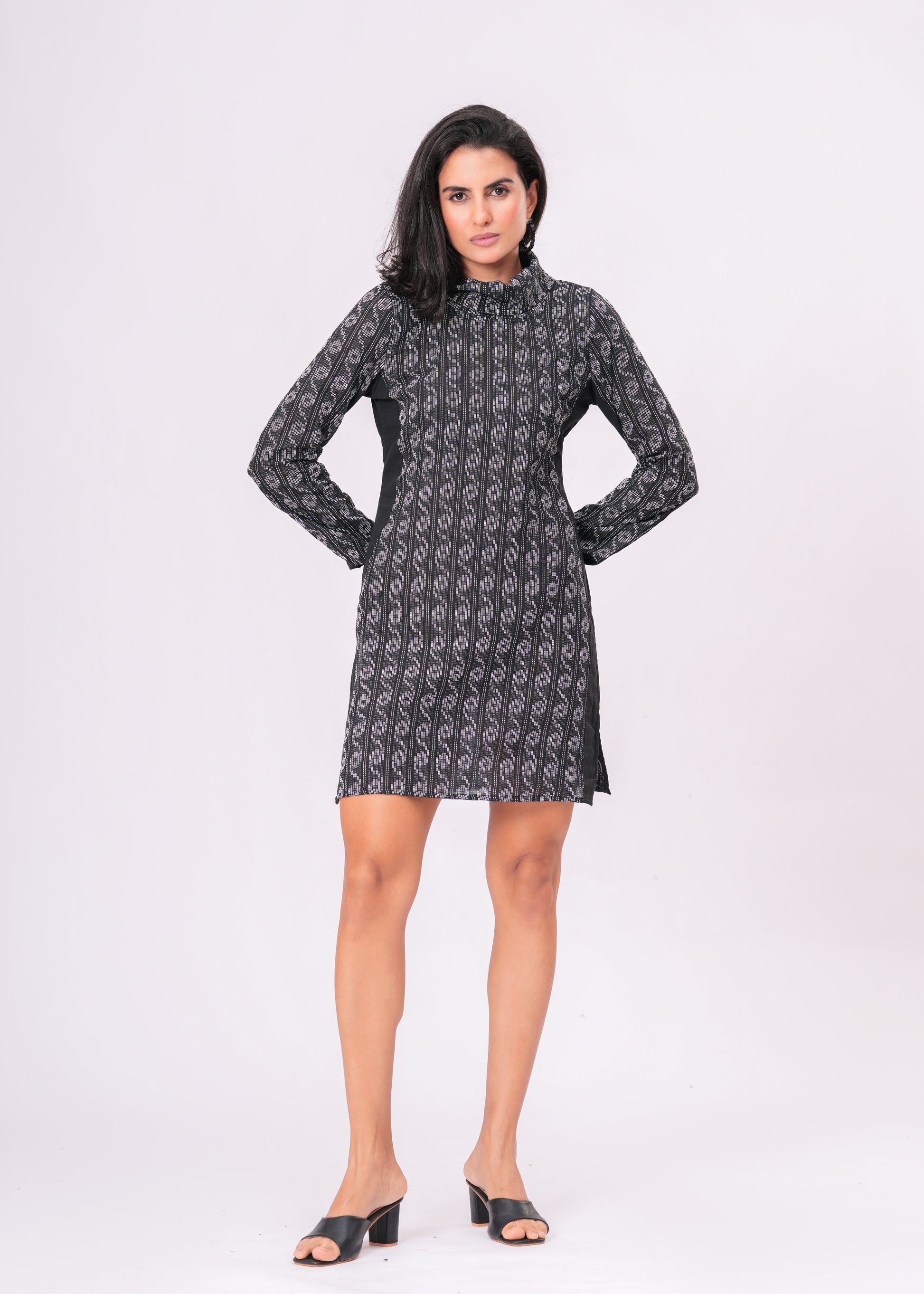 Make a bold statement with this chic black mini dress featuring intricate woven patterns and a structured high neck. The long sleeves and side slits add a modern edge, while the monochrome palette keeps it effortlessly sophisticated. Ideal for both daytime glam and evening outings, this dress blends traditional textile art with a contemporary silhouette.