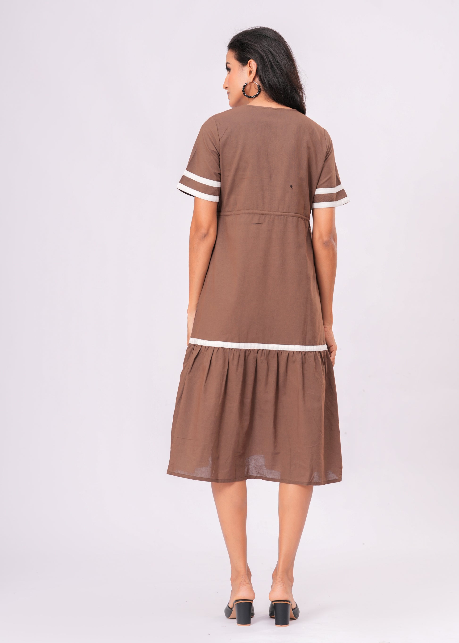 Keep it effortlessly stylish with this coffee brown midi dress featuring a flattering V-neck and adjustable drawstring waist with tassel ties. The short sleeves and tiered hem are accented with crisp white detailing, adding a fresh contrast to the earthy tone. Lightweight and easy to wear, this dress is perfect for casual days, brunch outings, or relaxed get-togethers.