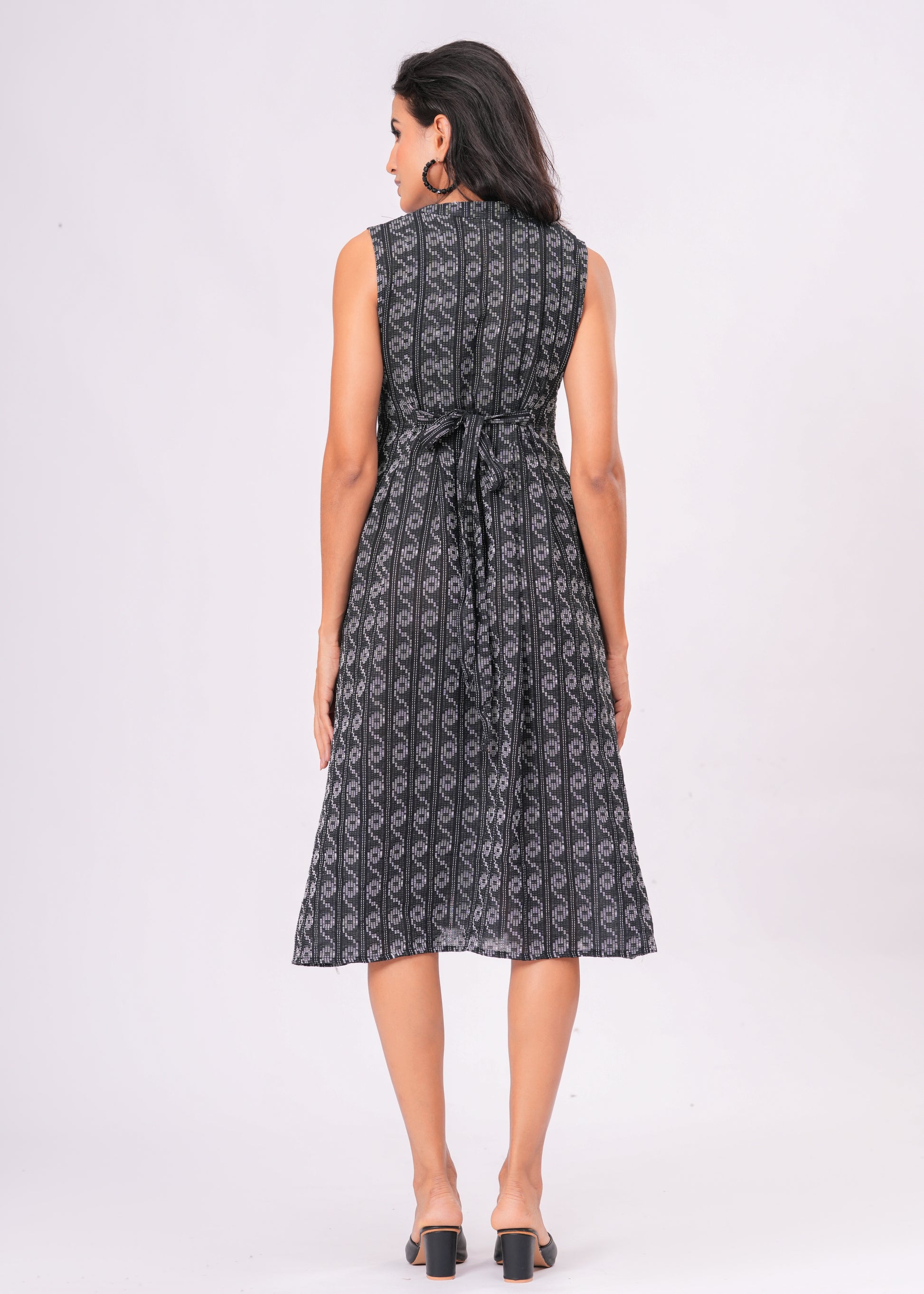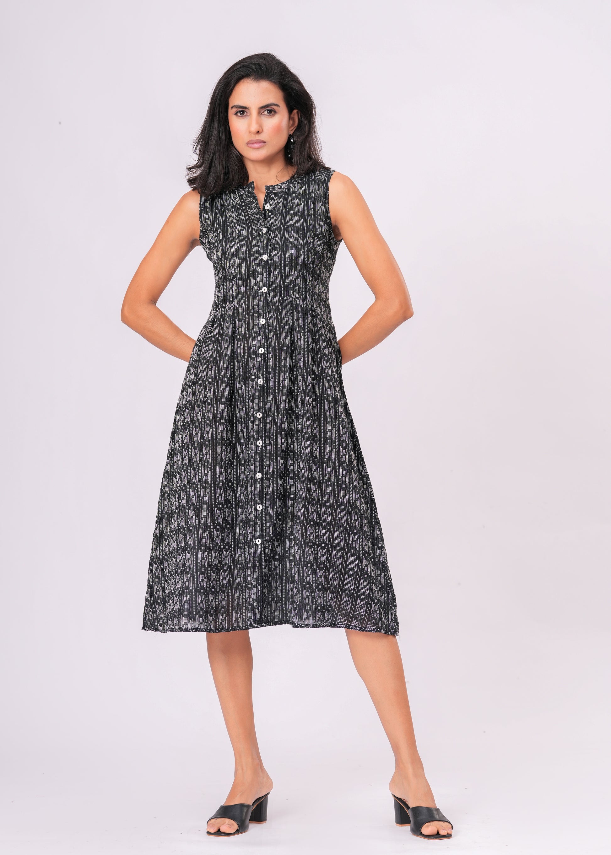 This sleeveless black dress features a classic A-line silhouette with an all-over ethnic-inspired print. Designed with a front button-down closure and a flattering fit, it effortlessly combines tradition with contemporary charm. Ideal for both casual and semi-formal occasions, it’s a versatile wardrobe essential.