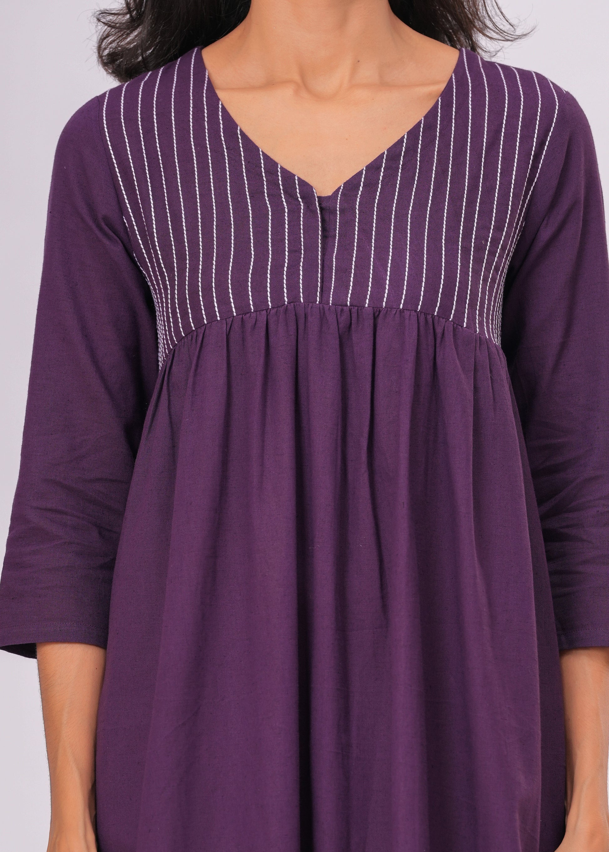 Step into effortless elegance with this deep purple midi dress. Designed with a flattering V-neckline and pin-tuck detailing on the bodice, it features a gathered empire waist for a flowy, feminine silhouette. The 3/4 sleeves add a classic touch, making it perfect for both everyday wear and relaxed evening outings. Crafted from breathable fabric, this dress combines comfort with refined style.