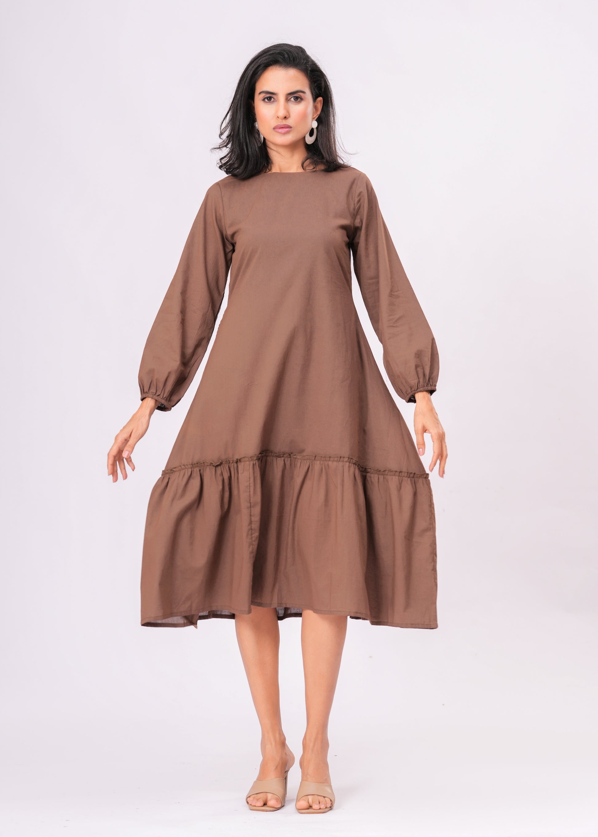 This chic brown midi dress features a minimalist design with a round neckline and full sleeves gathered at the cuffs. The subtle gathered tier at the hem adds a touch of flair to its relaxed silhouette. Crafted from soft, breathable fabric, it's perfect for effortless everyday elegance or a casual outing.