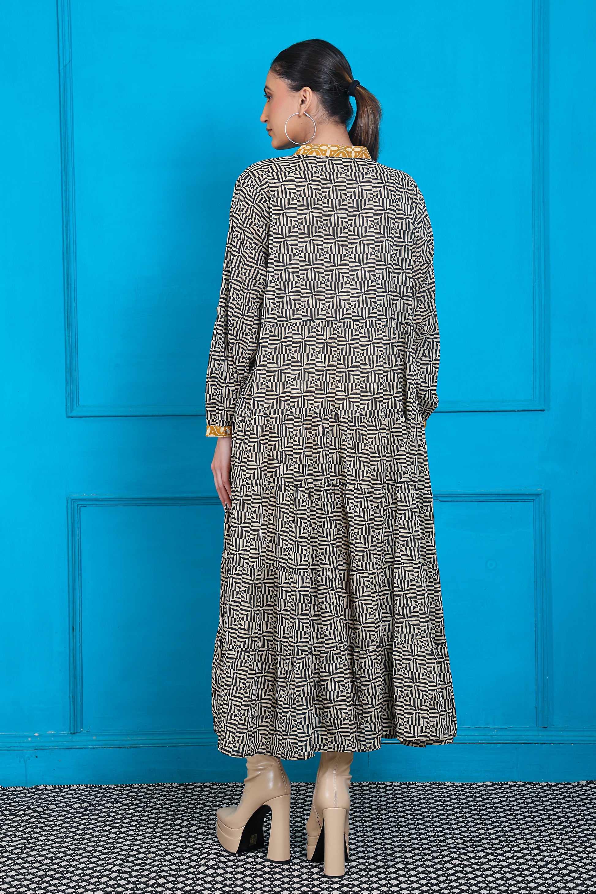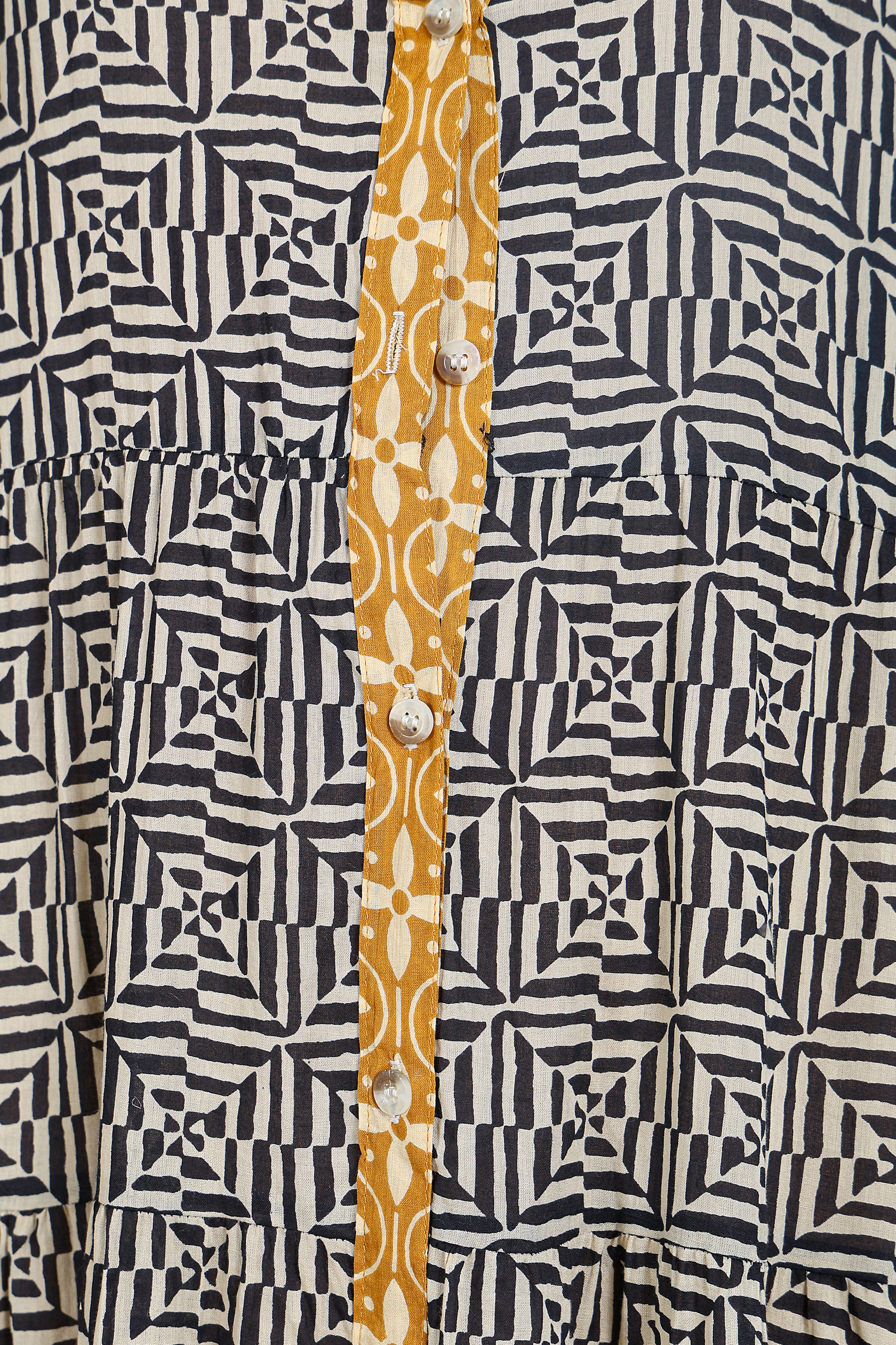 Make a Shasa fashion and lifestyle statement with this striking geometric print long shirt dress. The eye-catching black and white pattern features mesmerising spiral designs that create a stunning optical effect. This versatile dress showcases a classic button-down collar and full-length sleeves, perfect for both casual and semi-formal occasions. The knee-length cut and high-low hemline add a contemporary touch to the silhouette. Crafted with attention to detail, the dress includes practical side pockets and premium button closures. The comfortable fit allows for easy movement, while the crisp collar adds structure to the overall design. The monochromatic colour scheme makes it easy to accessorise with your favourite jewellery and footwear. This dress can be styled multiple ways - wear it as is for a sophisticated look, or pair it with a belt to accentuate your waist. Ideal for work meetings, brunches, or evening gatherings, this dress combines comfort with contemporary style.