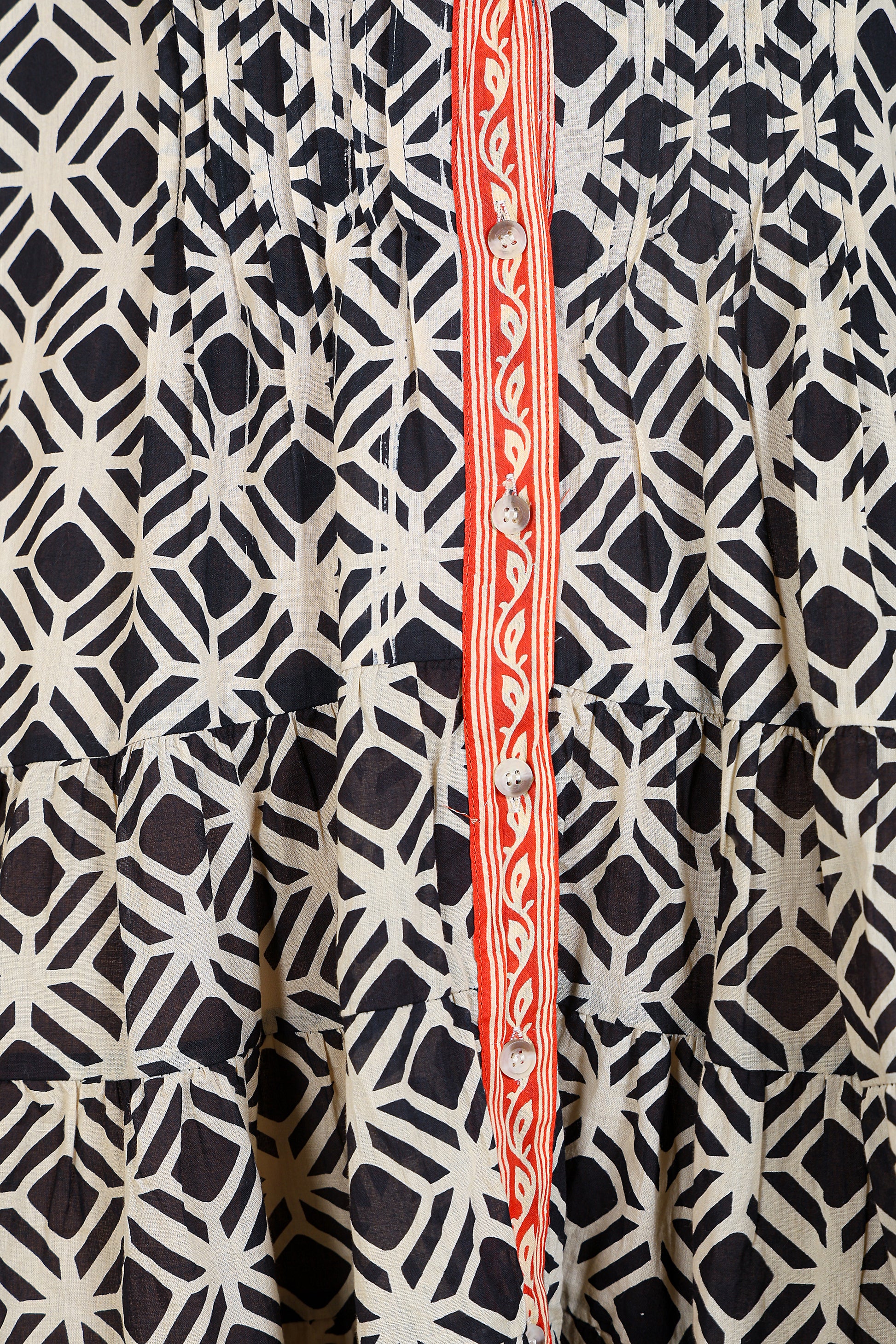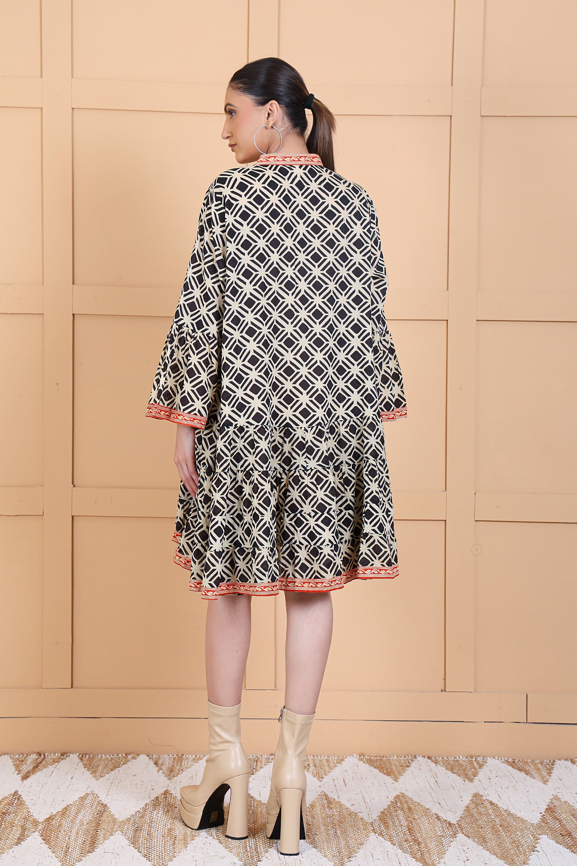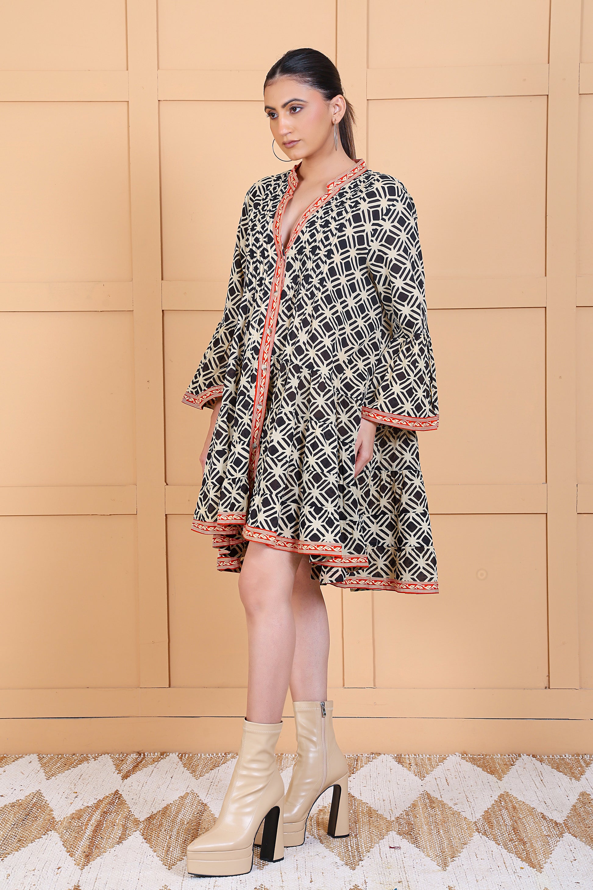 Luxe Full Sleeve Black Printed Pintuck Short Dress