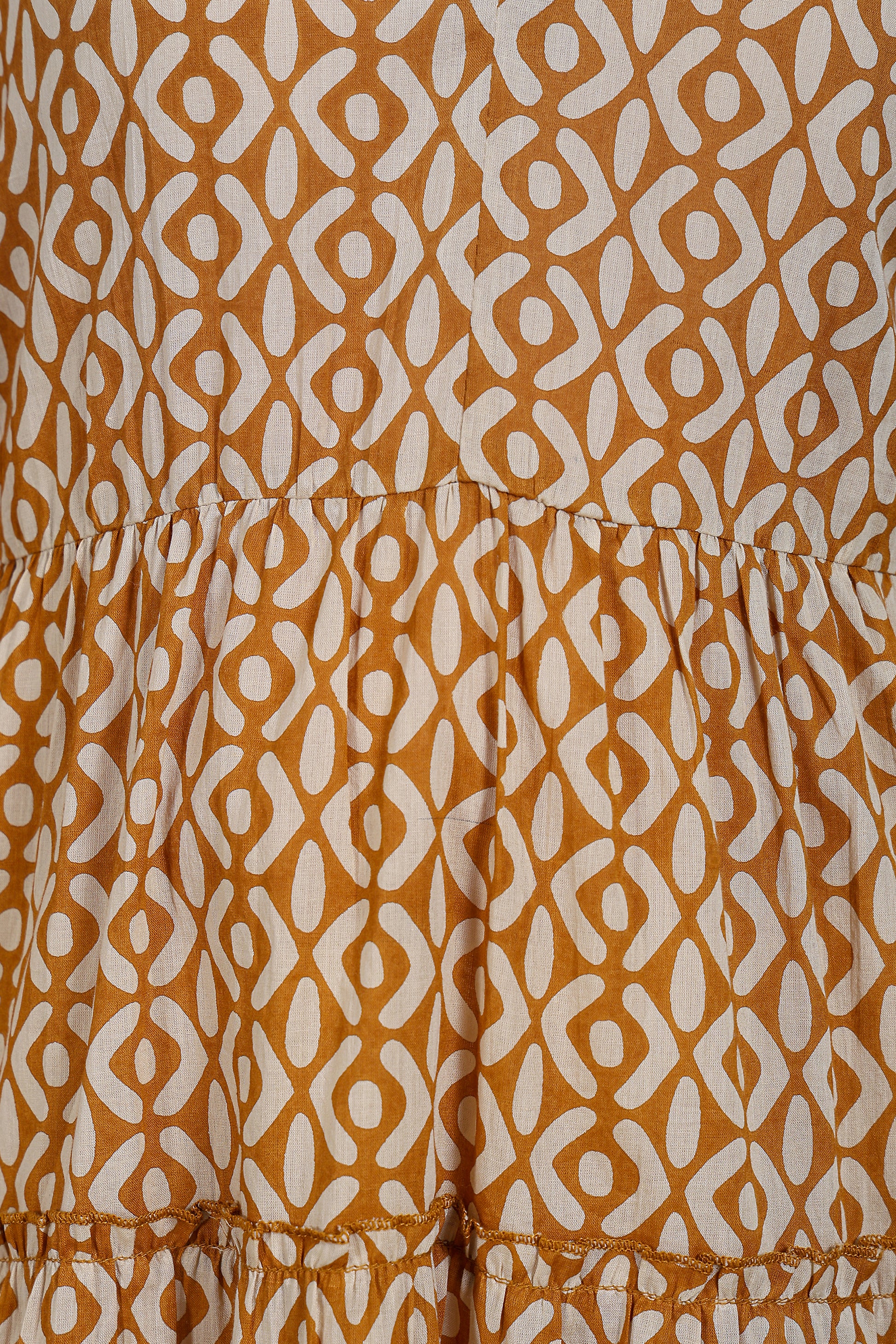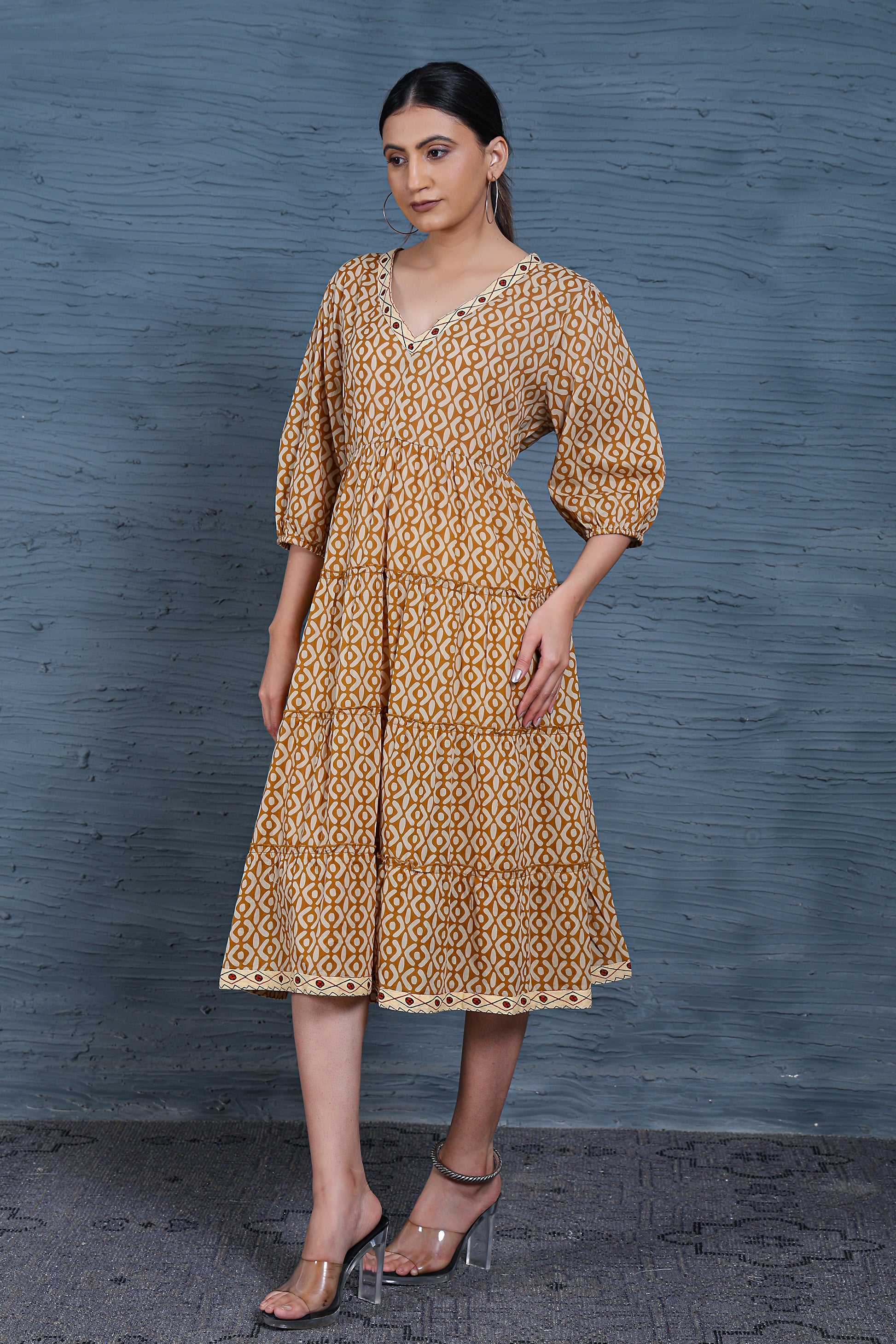 Luxe Three Fourth Sleeve Beige Printed Ruffle Dress