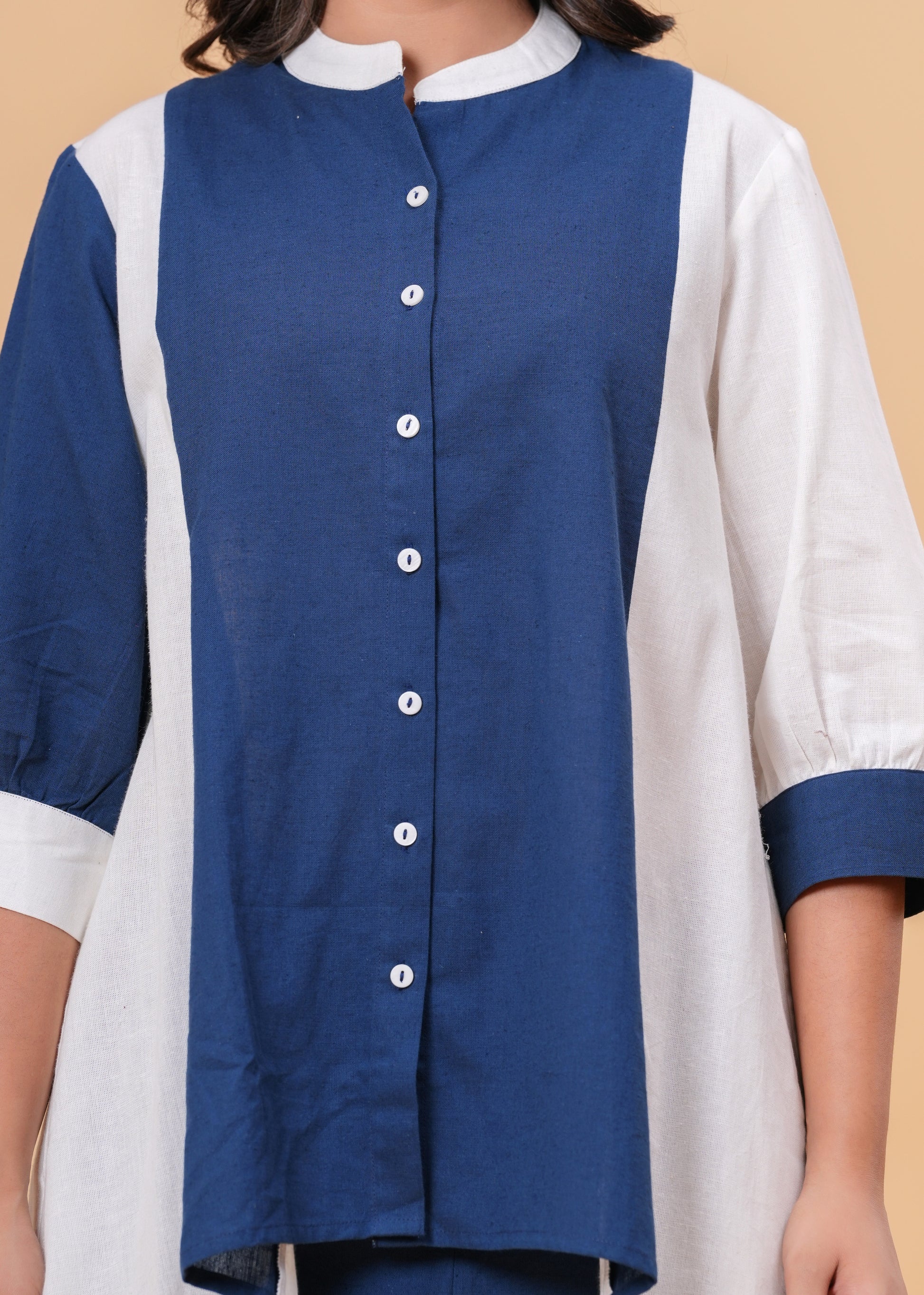 This elegant co-ord set features a relaxed-fit kurta with two practical pockets, crafted in a soft ivory fabric with Navy Blue accents. The top is designed with a round neckline, buttoned placket, and color-block detailing on the shoulder and sleeves. Paired with matching straight pants trimmed in Navy Blue at the hem, this ensemble blends minimal style with functional comfort — perfect for casual outings or relaxed workdays.