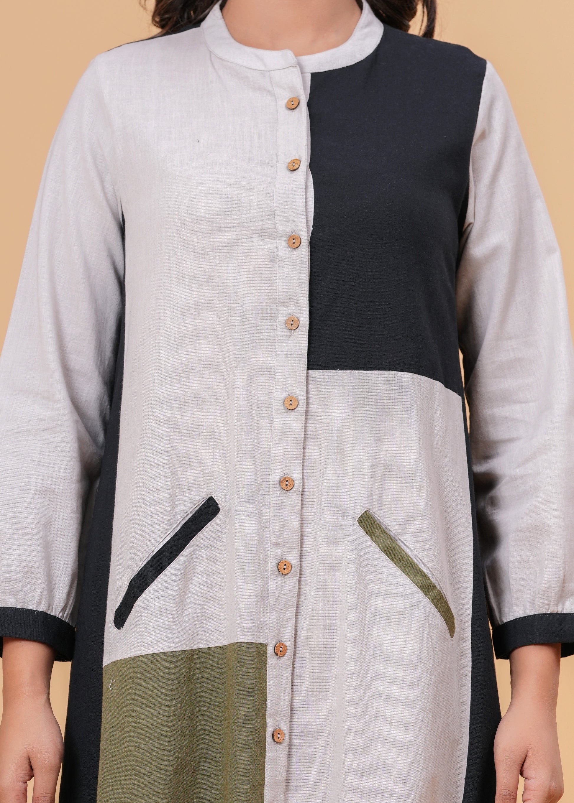 This is a stylish, color-blocked long kurti dress featuring a front button-down design. Crafted from breathable fabric, it combines shades of beige, black, and olive green in a modern patchwork pattern. The straight silhouette and full sleeves with cuff detailing add a touch of sophistication, making it perfect for casual or semi-formal wear.